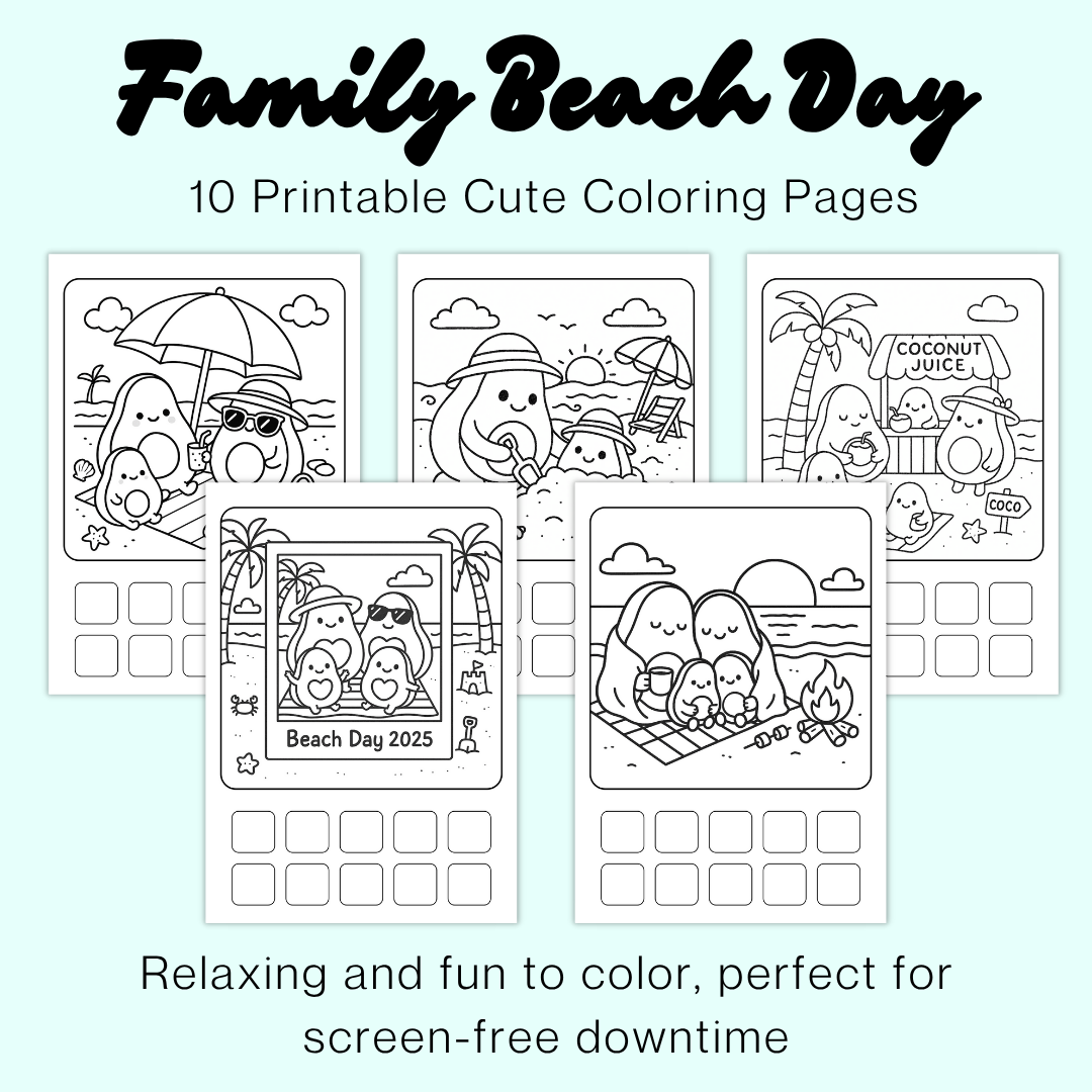 Cute Avocado Beach Day Coloring Pages | Bold & Easy Coloring Page Bundle